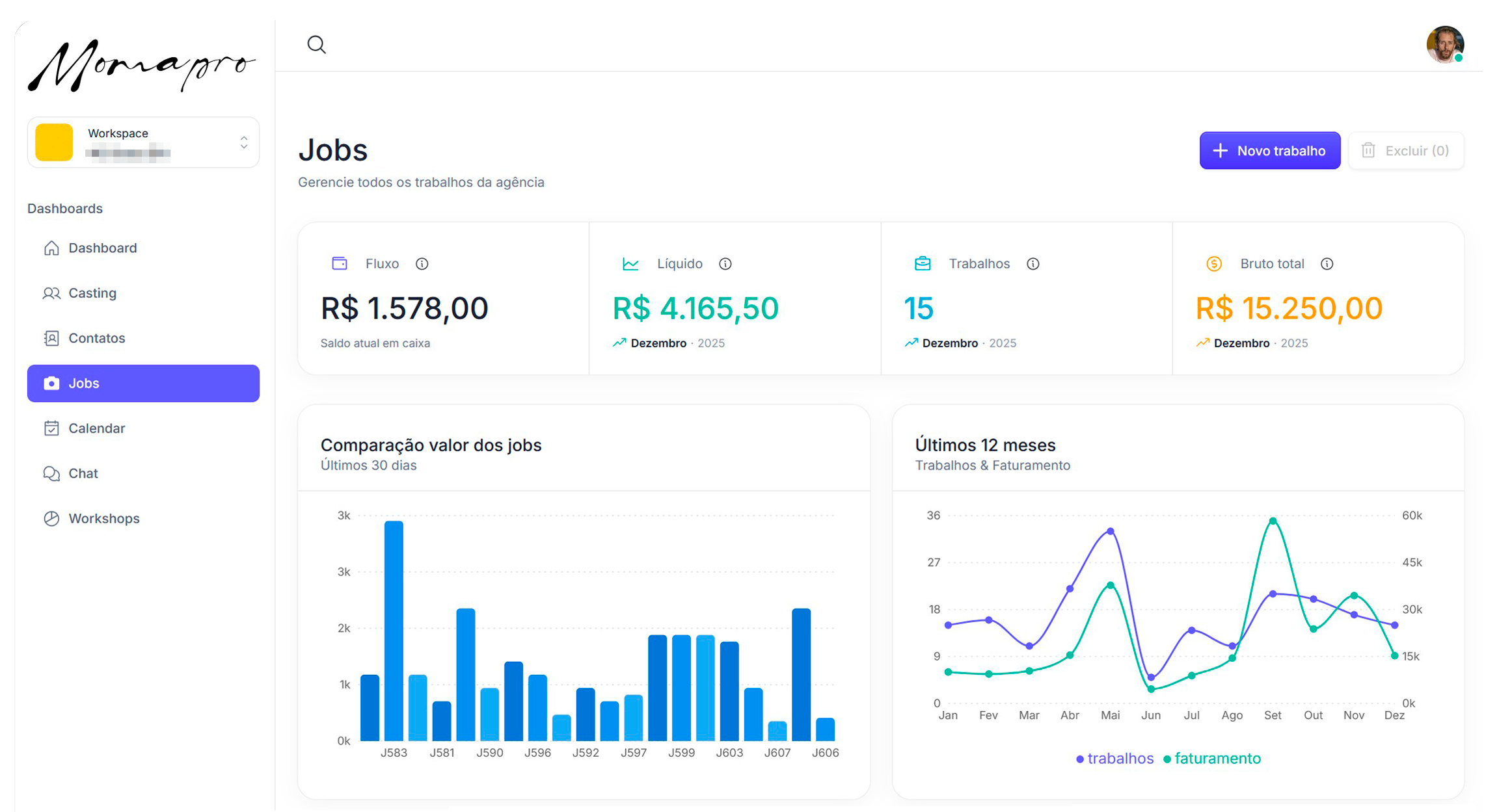 Crie um job em minutos: selecione o cliente, escolha talentos, defina valores e regras de pagamento. Tudo fica registrado e compartilhável com a equipe.